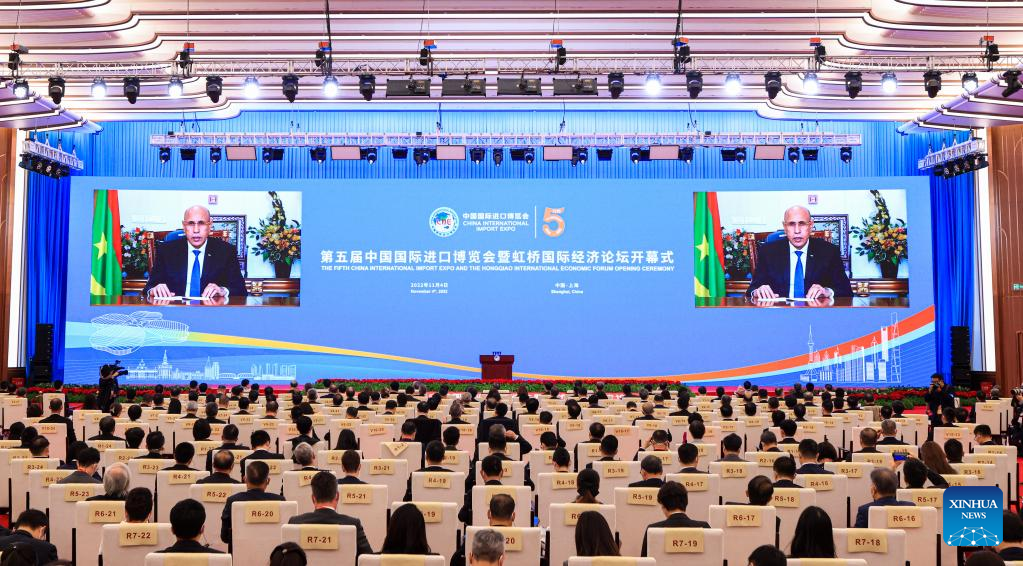 Mauritanian President Mohamed Ould Ghazouani speaks via video at the opening ceremony of the fifth China International Import Expo held at the National Exhibition and Convention Center (Shanghai) in east China's Shanghai on Nov. 4, 2022. (Xinhua/Li Jing)