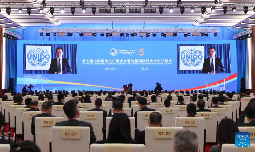 United Nations Industrial Development Organization (UNIDO) director-general Gerd Muller speaks via video at the opening ceremony of the fifth China International Import Expo held at the National Exhibition and Convention Center (Shanghai) in east China's Shanghai on Nov. 4, 2022. (Xinhua/Fang Zhe)