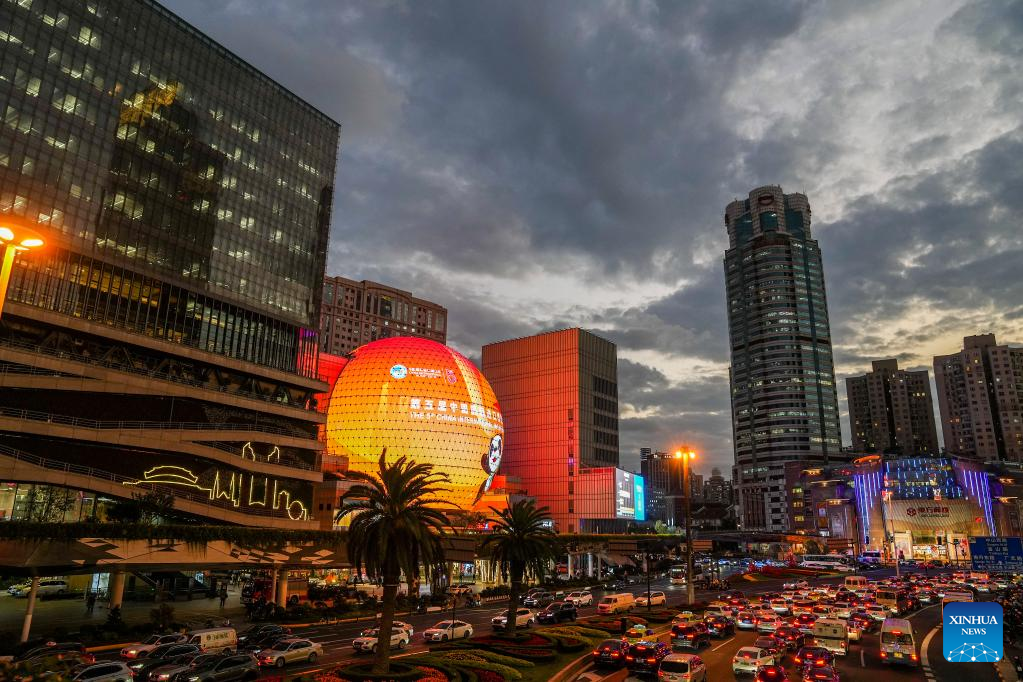 This photo taken on Nov. 4, 2022 shows an evening view at the Xujiahui area in east China's Shanghai. The fifth China International Import Expo (CIIE) is held in Shanghai from Nov. 5 to 10. (Xinhua/Ding Ting)