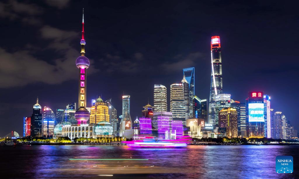 This photo taken on Nov. 4, 2022 shows an evening view of the Lujiazui area in east China's Shanghai. The fifth China International Import Expo (CIIE) is held in Shanghai from Nov. 5 to 10. (Xinhua/Wang Xiang)