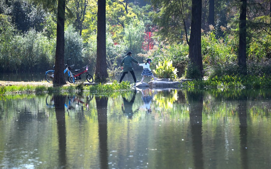 Local residents enjoy their leisure time at OCT Eco Wetland Park in Wuhan, capital of central China's Hubei Province, Nov. 3, 2022. (Xinhua/Cheng Min)