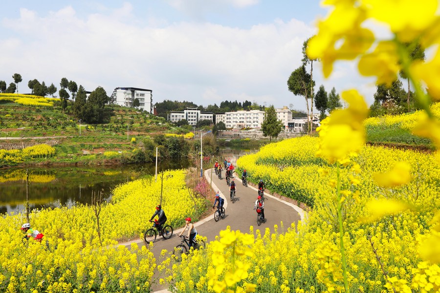 People ride bikes at a wetland park in Liangping District, southwest China's Chongqing, March 13, 2021. (Photo by Liu Hui/Xinhua)
