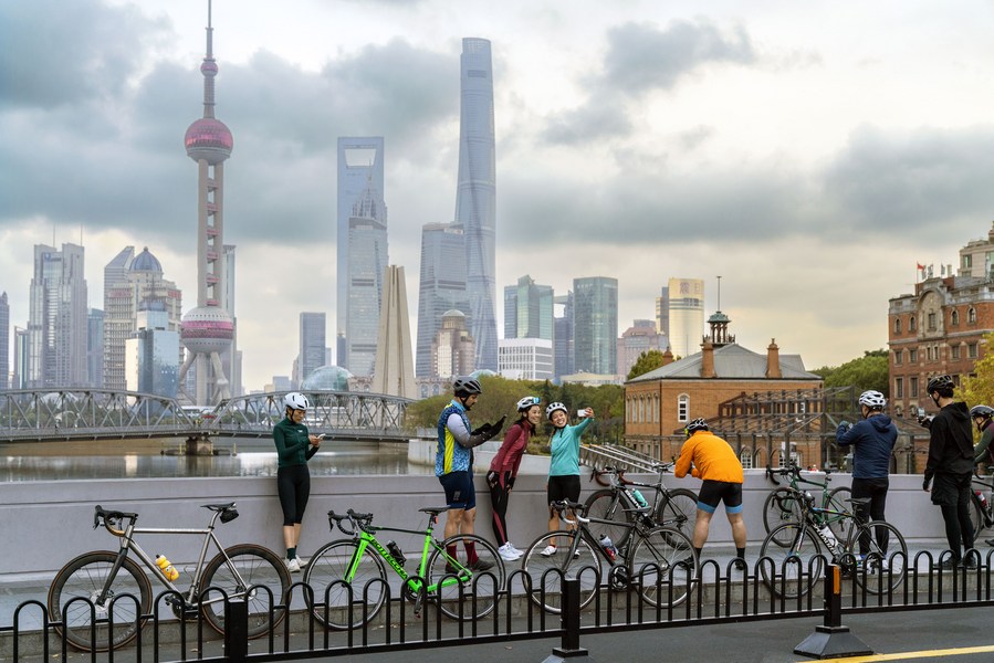 Cyclists take photos by the Suzhou Creek in east China's Shanghai, Nov. 4, 2022. The fifth China International Import Expo (CIIE) is held in Shanghai from Nov. 5 to 10. (Photo by Fan Yeqin/Xinhua)