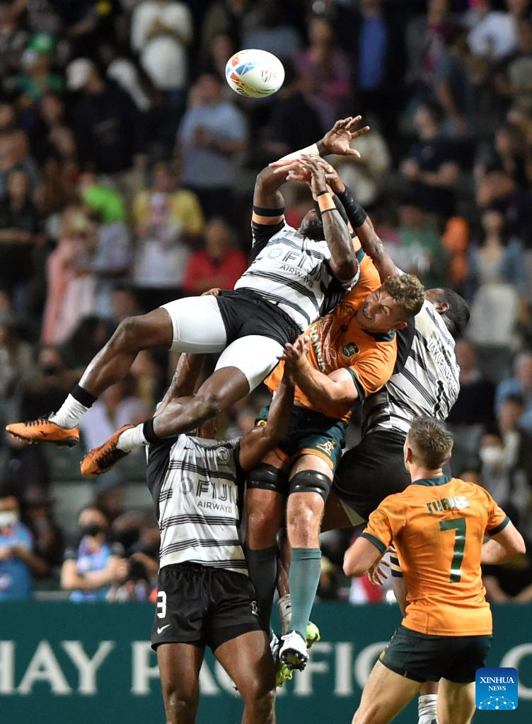 Nick Malouf (top C) of Australia vies for the ball during the rugby 7s final between Fiji and Australia at the Cathay Pacific/HSBC Hong Kong Sevens in Hong Kong, south China, Nov. 6, 2022. (Xinhua/Lo Ping Fai)