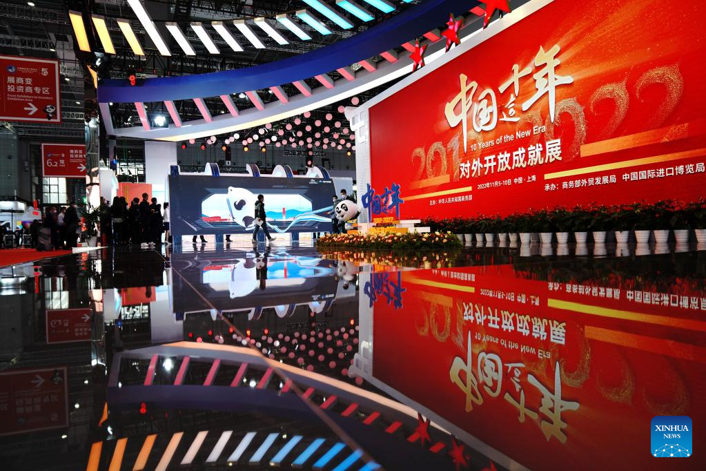 People visit an exhibition themed "Ten Years of the New Era" during the fifth China International Import Expo (CIIE) at the National Exhibition and Convention Center (Shanghai) in east China's Shanghai, Nov. 6, 2022.