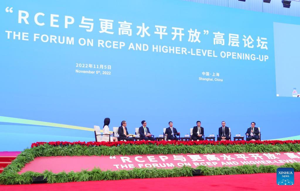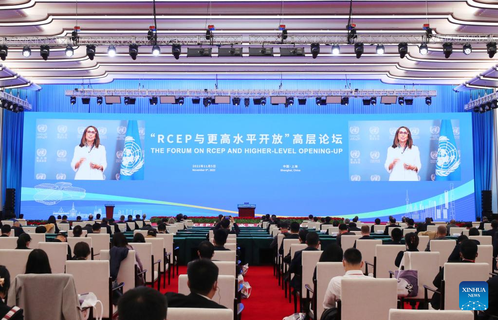 The Forum on the Regional Comprehensive Economic Partnership (RCEP) and Higher-level Opening-up is held in Shanghai, east China, Nov. 5, 2022. The session is a key event of this year's Hongqiao International Economic Forum. (Xinhua/Fang Zhe)