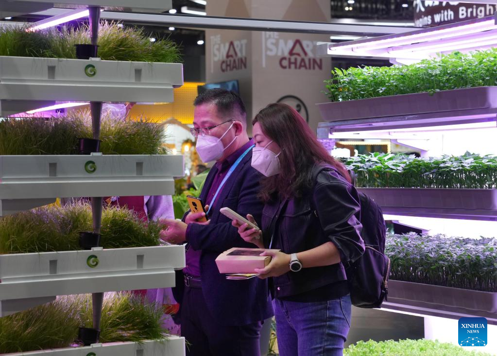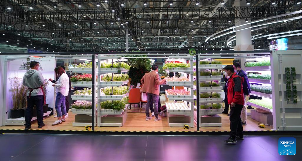 Visitors view vegetables growing on shelves at the food and agricultural products exhibition area of the fifth China International Import Expo (CIIE) in east China's Shanghai, Nov. 7, 2022. A seedling company displays vegetables growing on shelves to demonstrate new technologies of smart agriculture during the fifth CIIE in Shanghai. (Xinhua/Liu Ying)
