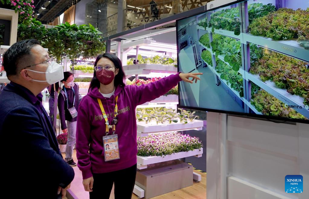 An exhibitor introduces agricultural technologies by showing the real-time scene of the monitor of a planting base at the food and agricultural products exhibition area of the fifth China International Import Expo (CIIE) in east China's Shanghai, Nov. 7, 2022. A seedling company displays vegetables growing on shelves to demonstrate new technologies of smart agriculture during the fifth CIIE in Shanghai. (Xinhua/Liu Ying)