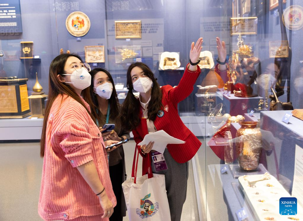 People visit the CIIE Culture Exhibition Hall during the fifth China International Import Expo (CIIE) at the National Exhibition and Convention Center (Shanghai) in east China's Shanghai, Nov. 7, 2022. Located in National Exhibition and Convention Center (Shanghai), the CIIE Culture Exhibition Hall showcases the CIIE's preparation process, highlights and effects, attracting many visitors during the fifth edition of the expo. (Xinhua/Jin Liwang)