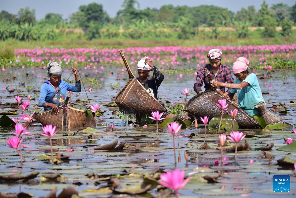 Women catch fish amid blooming water lily flowers in a lake at a village in Morigaon district of India's northeastern state of Assam, Nov. 6, 2022. (Str/Xinhua)