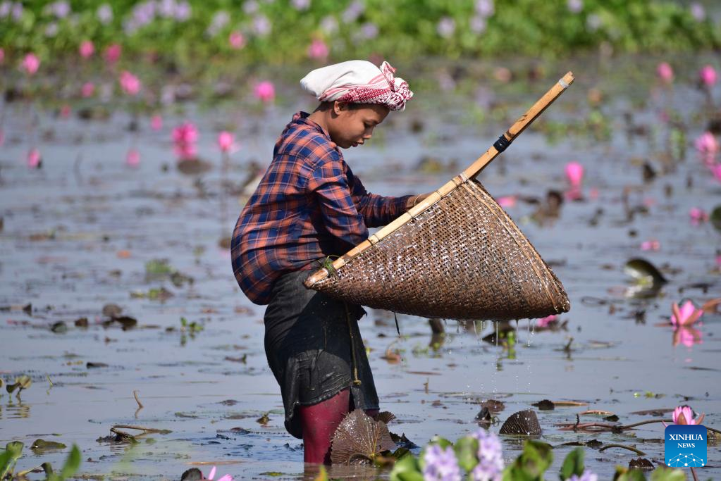 A woman catches fish amid blooming water lily flowers in a lake at a village in Morigaon district of India's northeastern state of Assam, Nov. 6, 2022. (Str/Xinhua)