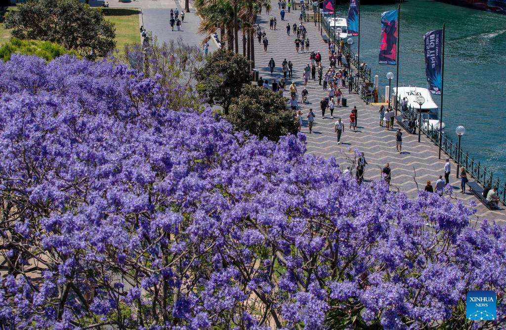 People walk under jacaranda blooms in Sydney, Australia, on Nov. 7, 2022. (Xinhua/Bai Xuefei)