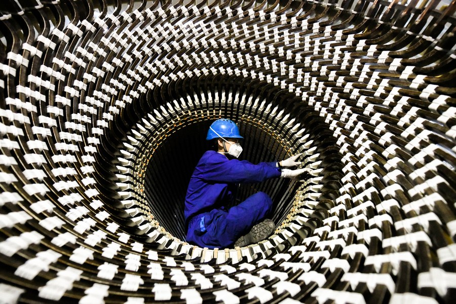 A worker works at a factory of Harbin Electric Machinery Company Ltd. of Harbin Electric Corporation in Harbin, northeast China's Heilongjiang Province, Sept. 3, 2022. (Xinhua/Wang Song)