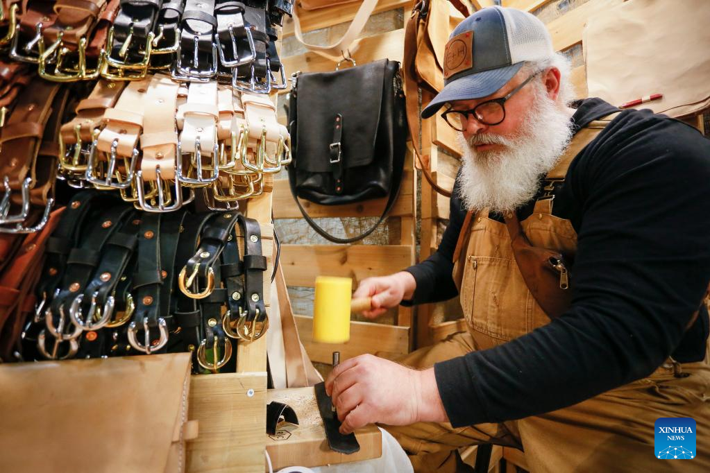 A vendor demonstrates the making of a leather belt at the Circle Craft Christmas Market in Vancouver, British Columbia, Canada, on Nov. 9, 2022. (Photo by Liang Sen/Xinhua)