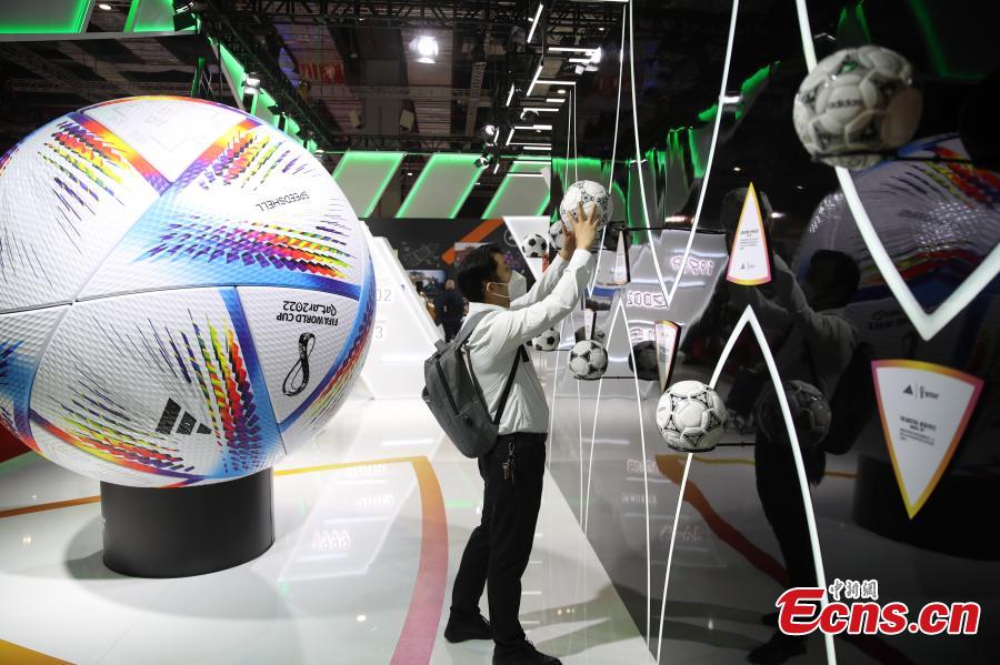 A jumbo-sized version of the official match ball of the FIFA World Cup Qatar 2022, with a diameter of 2.2 meters, is on display at the 5th CIIE in Shanghai, Nov. 9, 2022. Official match balls from the previous Would Cups are also exhibited at the 5th CIIE. (Photo: China News Service/Zhang Hengwei)