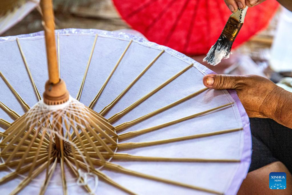 An artisan makes a paper umbrella in Chiang Mai, Thailand, on Nov. 9, 2022. (Xinhua/Wang Teng)