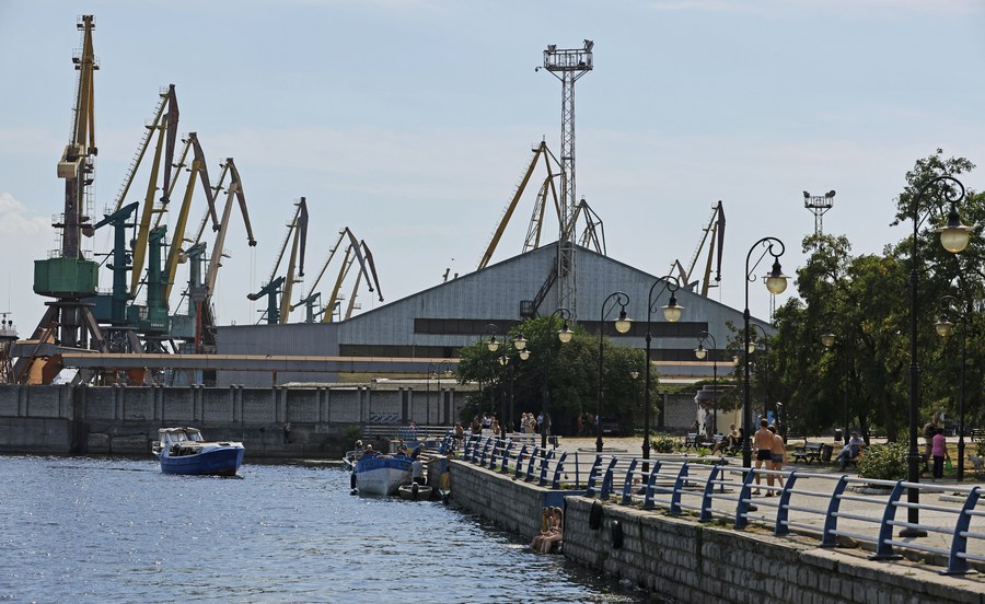 Photo taken on July 24, 2022 shows the view of a harbor in the Kherson region. (Photo by Victor/Xinhua)