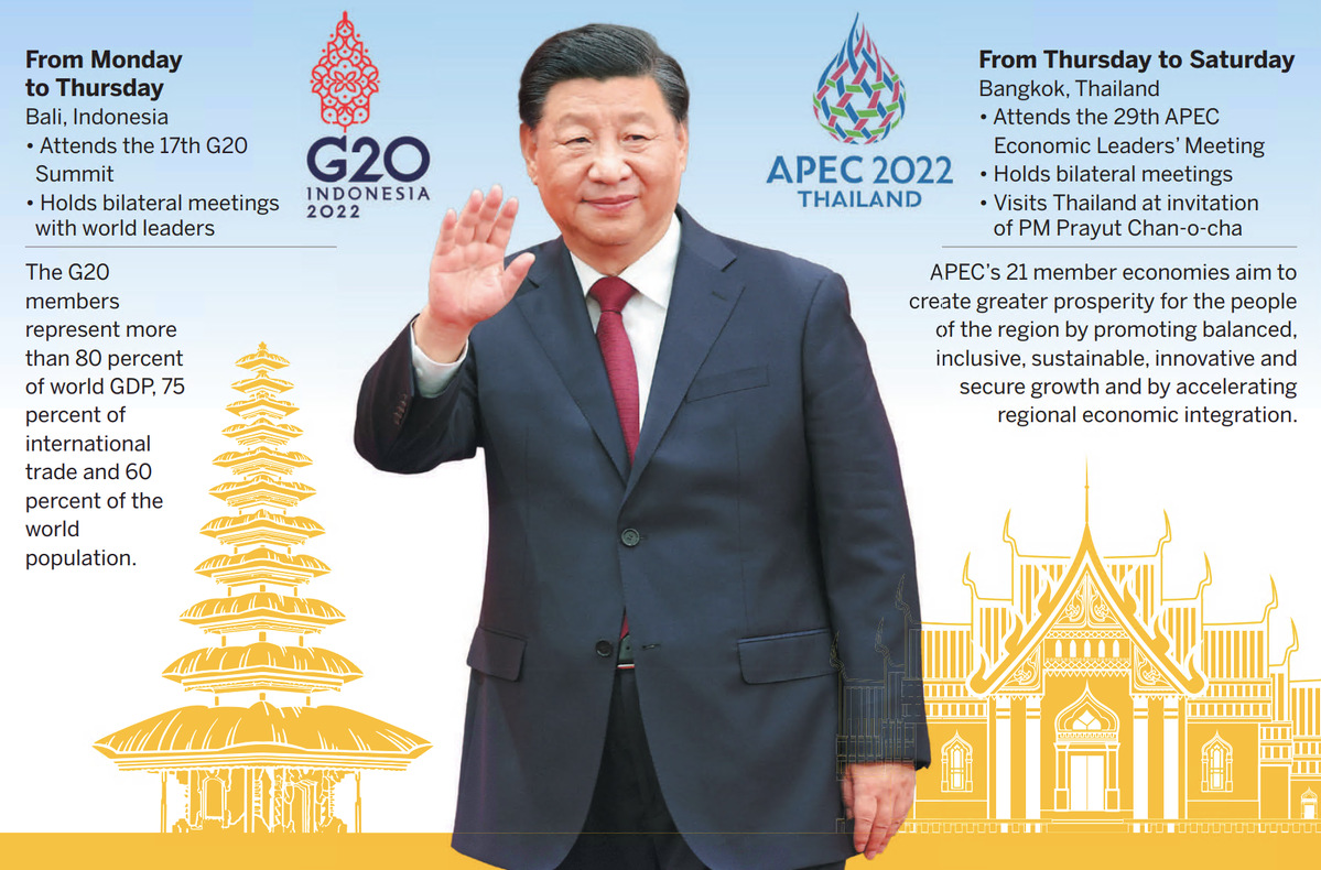Xi will attend the 17th G20 Summit in Bali, Indonesia, from Monday to Thursday, before attending the 29th APEC Economic Leaders' Meeting in Bangkok and visiting Thailand from Thursday to Saturday, according to the Chinese Foreign Ministry.