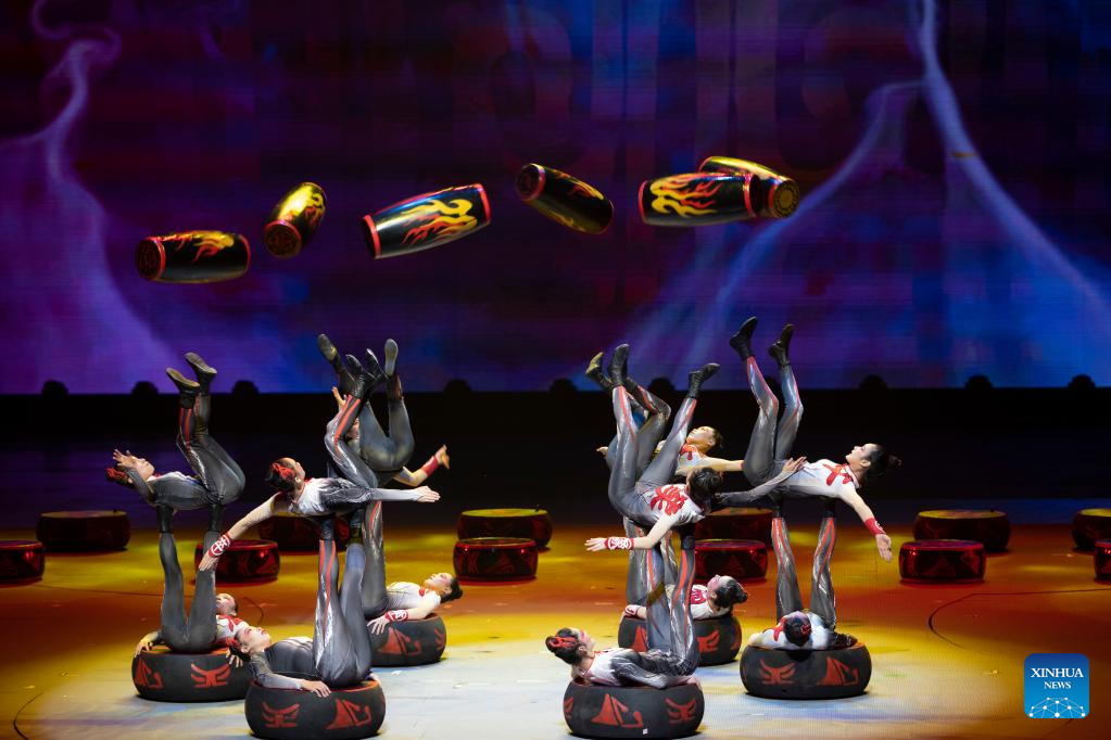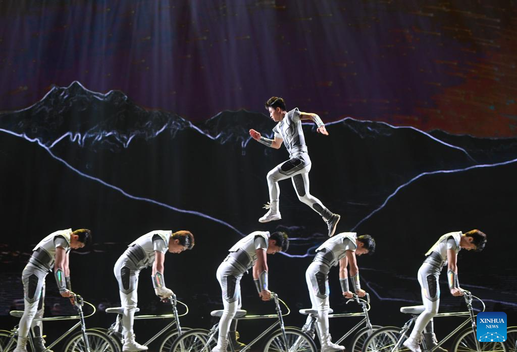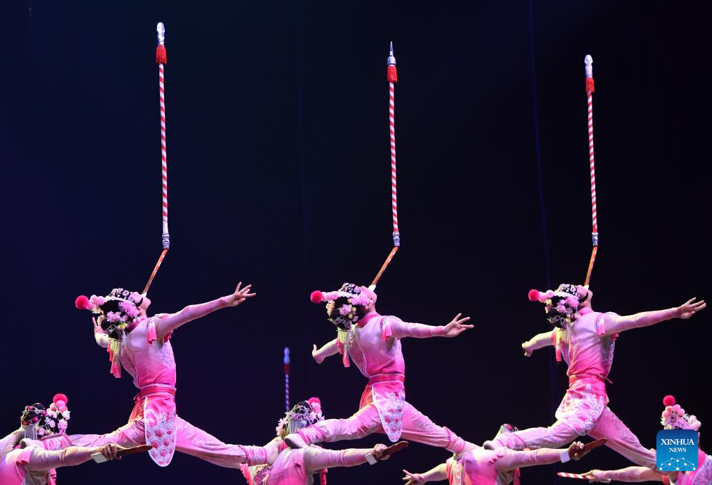Artists perform during the 11th China Acrobatics Golden Chrysanthemum Awards Competition held in Puyang, central China's Henan Province, Nov. 9, 2022. This award is deemed the highest honor in China for acrobatics. (Xinhua/Li Jianan)