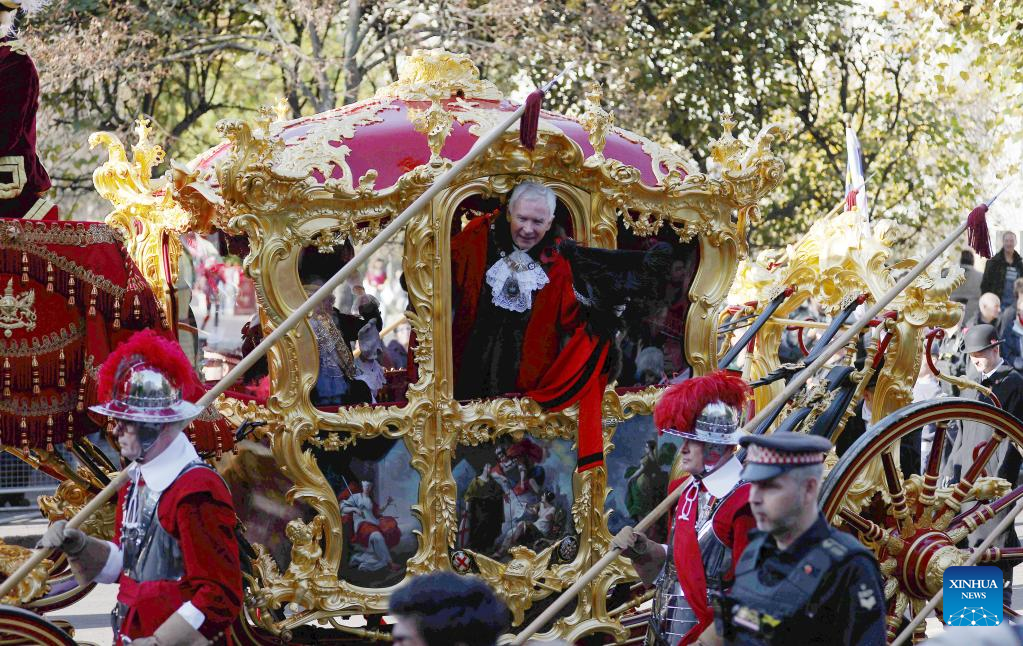 Alderman Nicholas Lyons, 694th Lord Mayor of the City of London, waves to crowds during the Lord Mayor's Show in London, Britain, on Nov. 12, 2022. (Xinhua/Li Ying)