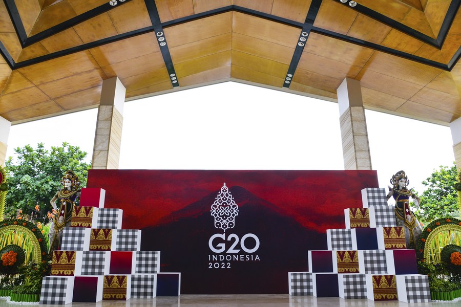 This photo taken on Nov. 11, 2022 shows logos and decorations for the upcoming 17th Group of 20 (G20) Summit outside a venue for the summit in Bali, Indonesia. (Xinhua/Xu Qin)