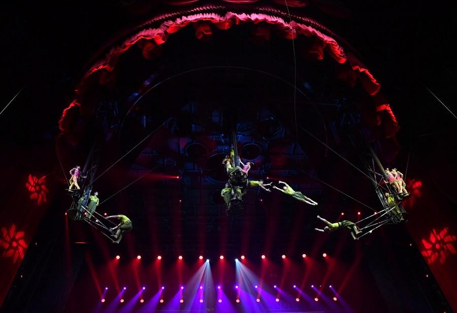 Artists perform during the 11th China Acrobatics Golden Chrysanthemum Awards Competition held in Puyang, central China's Henan Province, Nov. 9, 2022. (Xinhua/Xu Jiayi)