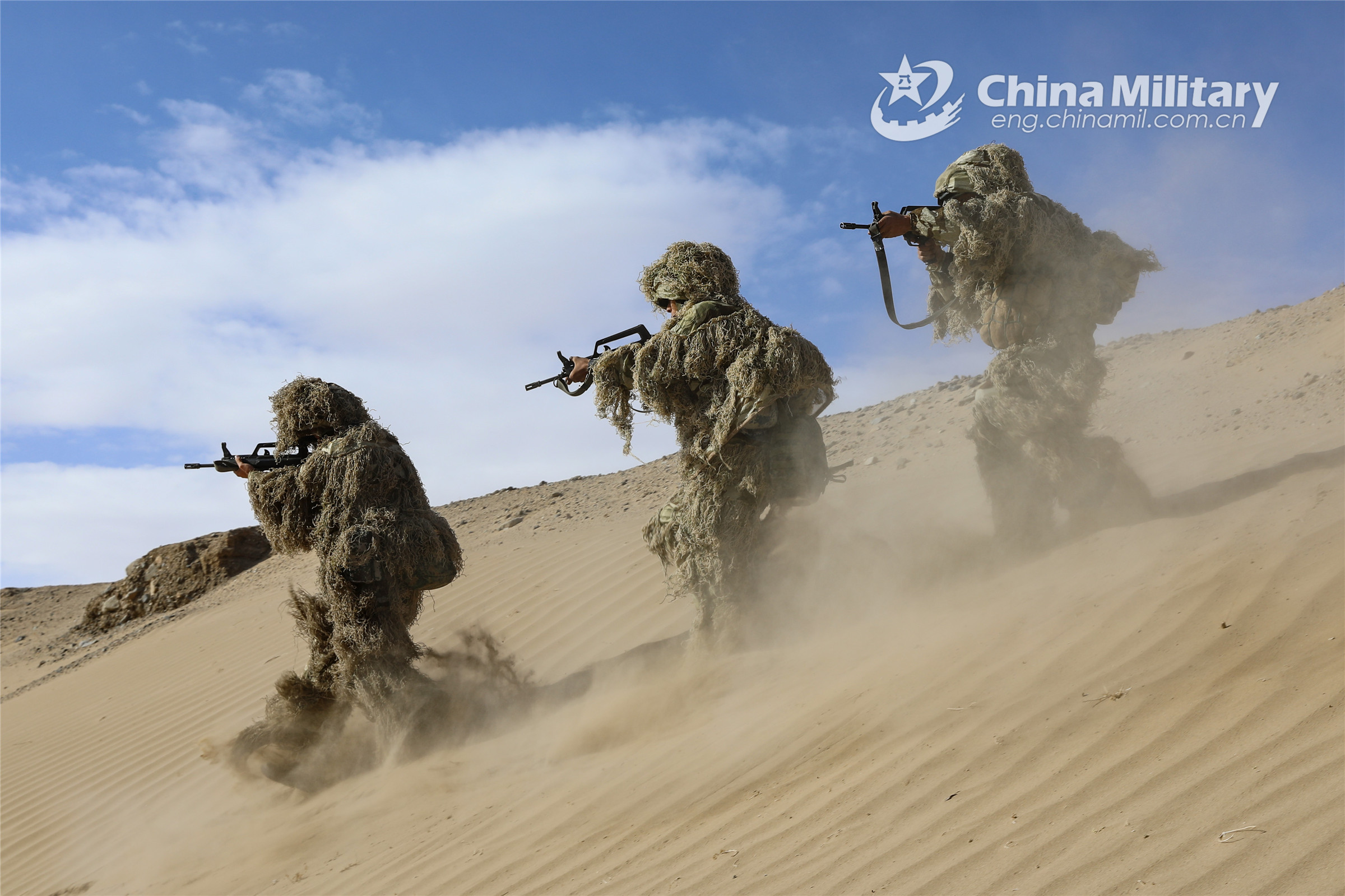 Members assigned to a reconnaissance element with an airborne brigade provide cover for each other in their ghillie suits during a tactical operation in unfamiliar terrain on October 14, 2022. (eng.chinamil.com.cn/Photo by Wang Bin)