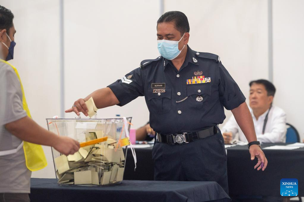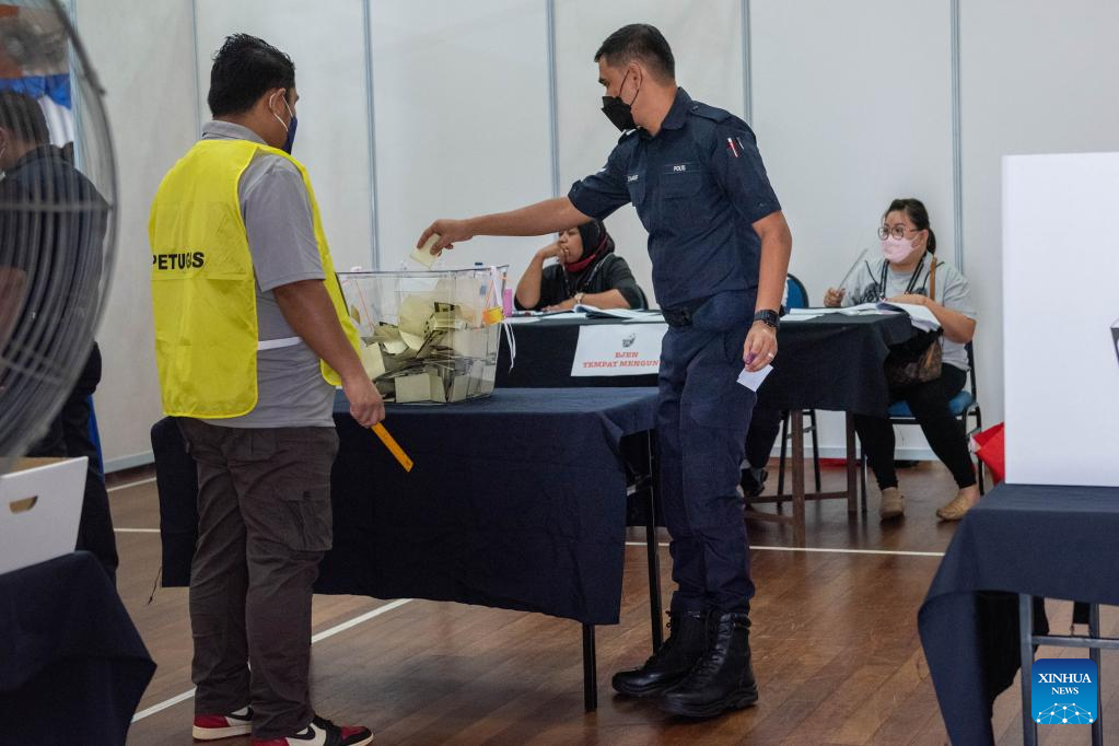 A police officer casts the vote in the early voting of the general election in Kuala Lumpur, Malaysia, Nov. 15, 2022. Malaysia will hold the general election on Nov. 19. (Photo by Chong Voon Chung/Xinhua)
