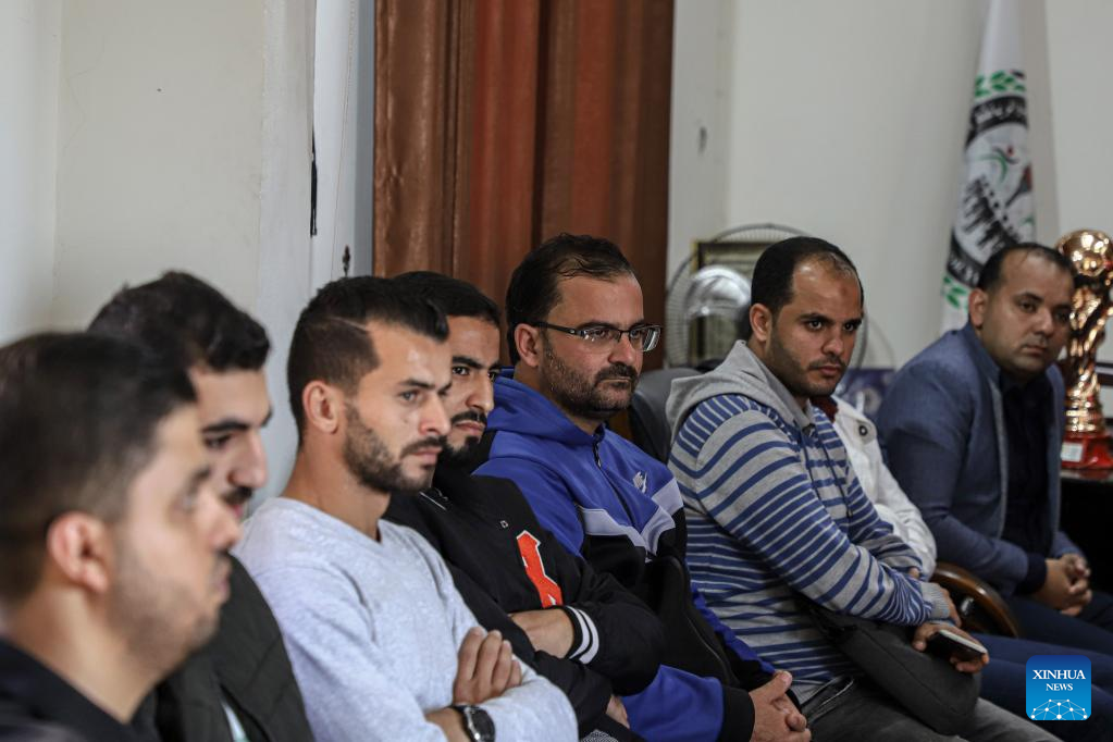 Palestinian volunteers for the FIFA World Cup Qatar 2022 attend a meeting in Gaza City, Nov. 10, 2022.(Photo by Rizek Abdeljawad/Xinhua)