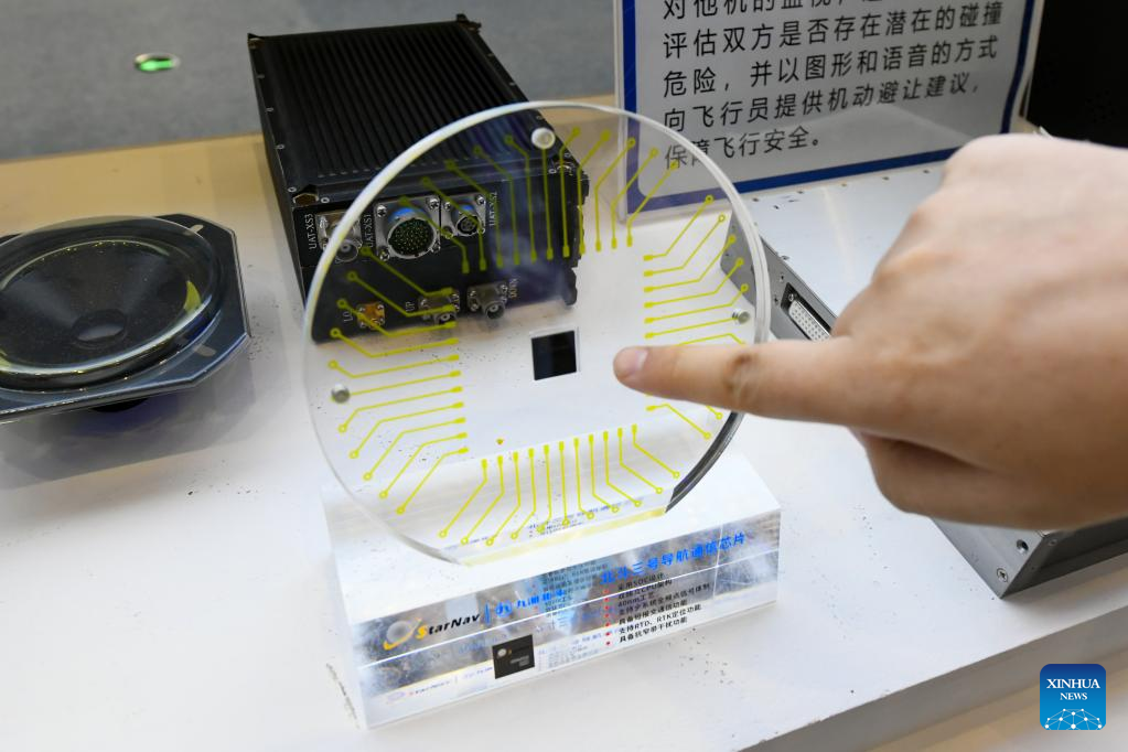 A communication chip of China's BeiDou-3 Navigation Satellite System is on display at the 10th China (Mianyang) Science and Technology City International High-Tech Expo in Mianyang, southwest China's Sichuan Province, Nov. 16, 2022. (Xinhua/Tang Wenhao)