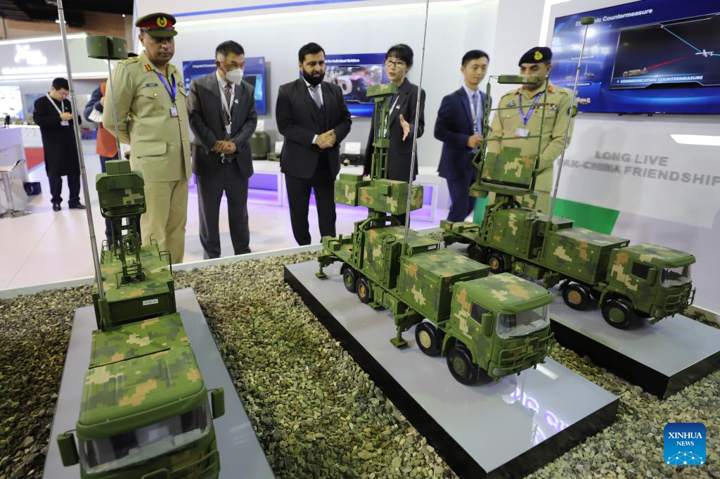 People visit the China Pavilion at the International Defense Exhibition and Seminar (IDEAS) in Karachi, Pakistan, on Nov. 15, 2022. The 11th edition of IDEAS kicked off on Tuesday at the Karachi Expo Center in Pakistan's southern port city of Karachi. (Xinhua/Jiang Chao)