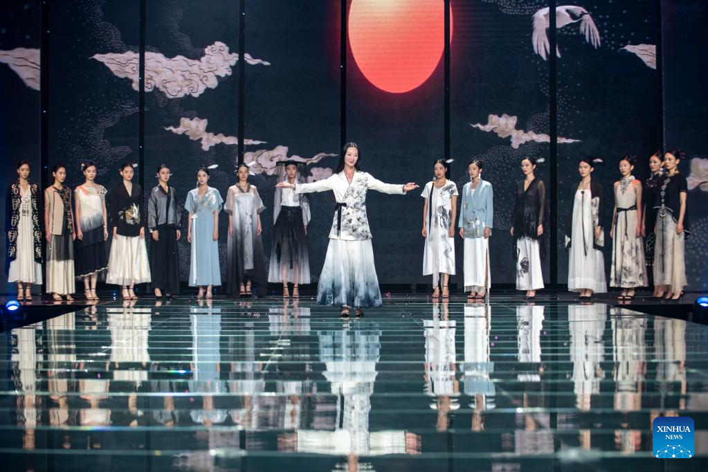 A designer (C) displays her creations during the opening ceremony of an ethnic clothing festival held in Kunming, southwest China's Yunnan Province, Nov. 15, 2022. Creations from different ethnic groups of Yunnan will be presented during the ethnic clothing festival. (Xinhua/Chen Xinbo)