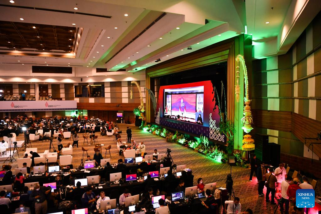 Journalists arrive for a press conference at the press center for the 17th Group of 20 (G20) Summit in Bali, Indonesia, Nov. 16, 2022. The 17th G20 Summit concluded here on Wednesday. (Xinhua/Xu Qin)