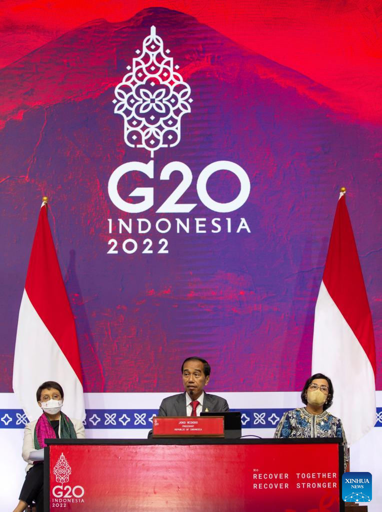 Indonesian President Joko Widodo (C) attends the closing press conference of the Group of 20 (G20) Summit in Bali, Indonesia, Nov. 16, 2022. The 17th G20 Summit concluded here on Wednesday. (Xinhua/Wang Yiliang)