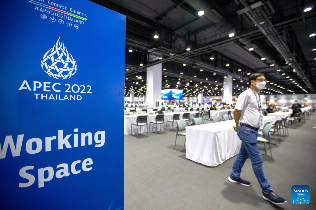 A staff member walks at the media center of APEC 2022 in Bangkok, Thailand, Nov. 14, 2022. The 29th Asia-Pacific Economic Cooperation (APEC) Economic Leaders' Meeting will be held in Bangkok, Thailand, on Nov. 18-19. (Xinhua/Wang Teng)