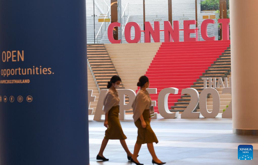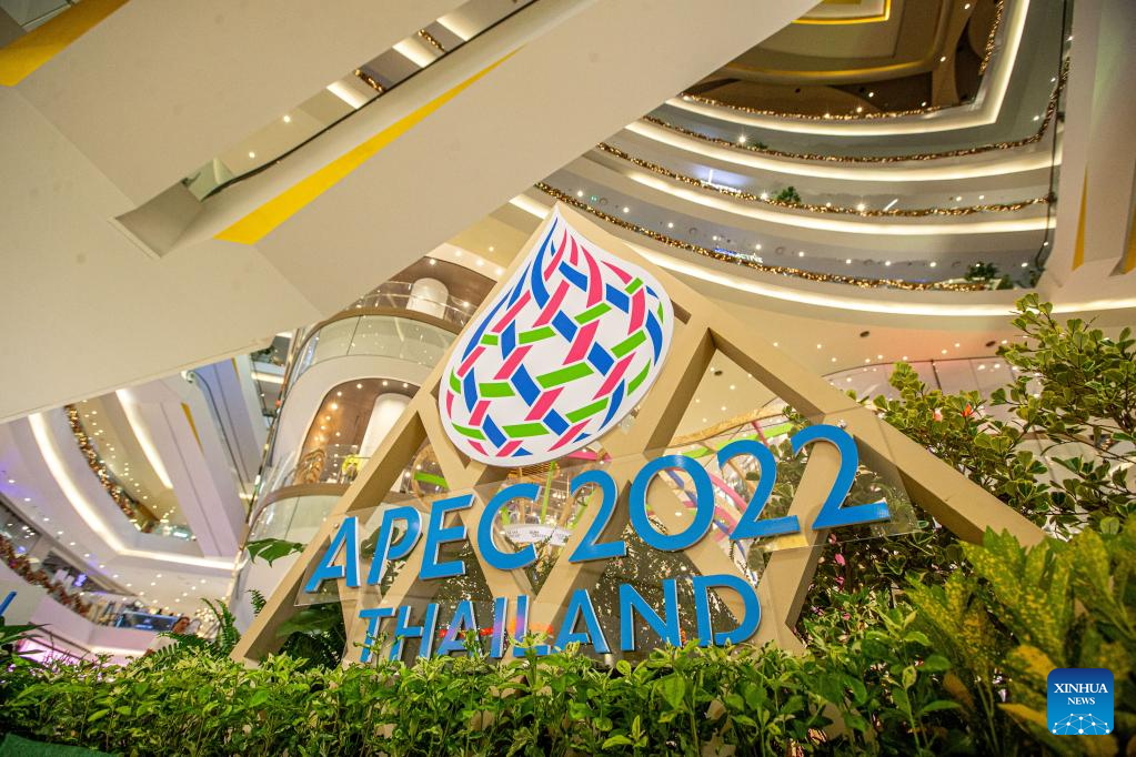 A logo of APEC 2022 is pictured in Bangkok, Thailand, Nov. 16, 2022. The 29th Asia-Pacific Economic Cooperation (APEC) Economic Leaders' Meeting will be held in Bangkok, Thailand, on Nov. 18-19. (Xinhua/Wang Teng)