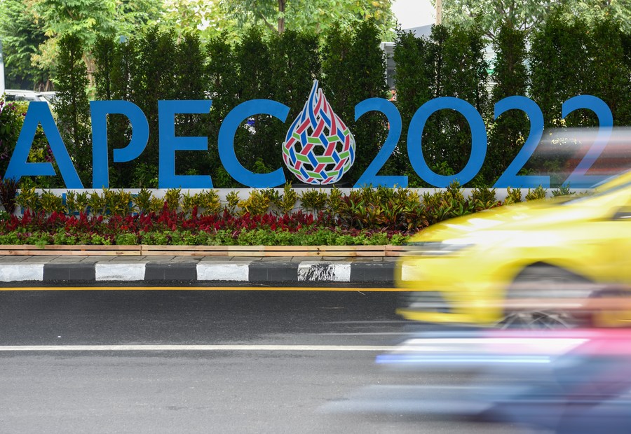 A logo of APEC 2022 is pictured on a street in Bangkok, Thailand, Nov. 16, 2022. (Xinhua/Wang Teng)