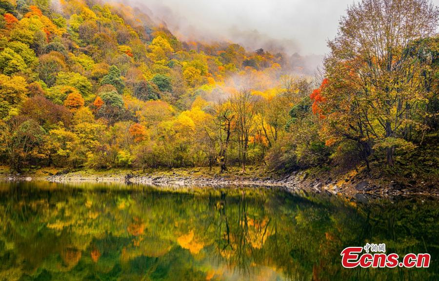 Landscape of the Moon Lake and colorful mountains enveloped in the mist on a winter morning, creating a mysterious scenery in Ya'an City, southwest China's Sichuan Province.(Photo/China News Service)