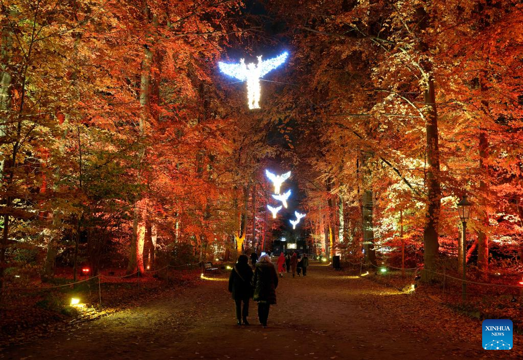 Visitors walk past light decorations during the "Christmas Garden Berlin" light show at the Botanical Garden in Berlin, Germany, Nov. 16, 2022. (Photo by Stefan Zeitz/Xinhua)