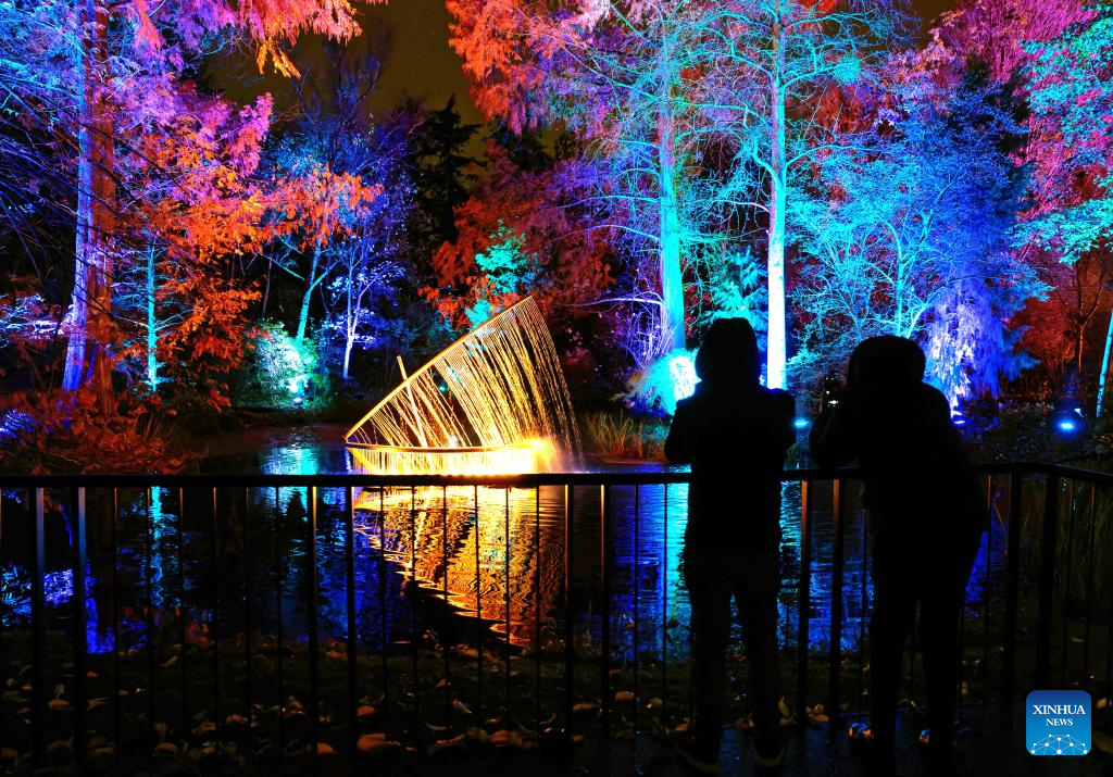 Visitors look at light decorations during the "Christmas Garden Berlin" light show at the Botanical Garden in Berlin, Germany, Nov. 16, 2022. (Photo by Stefan Zeitz/Xinhua)