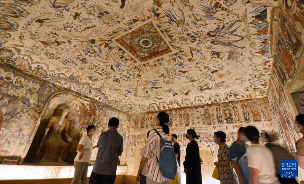 Visitors watch a replica of Cave 285 of the Mogao Grottoes of Dunhuang in Beijing on July 10, 2022. (Photo/Xinhua)