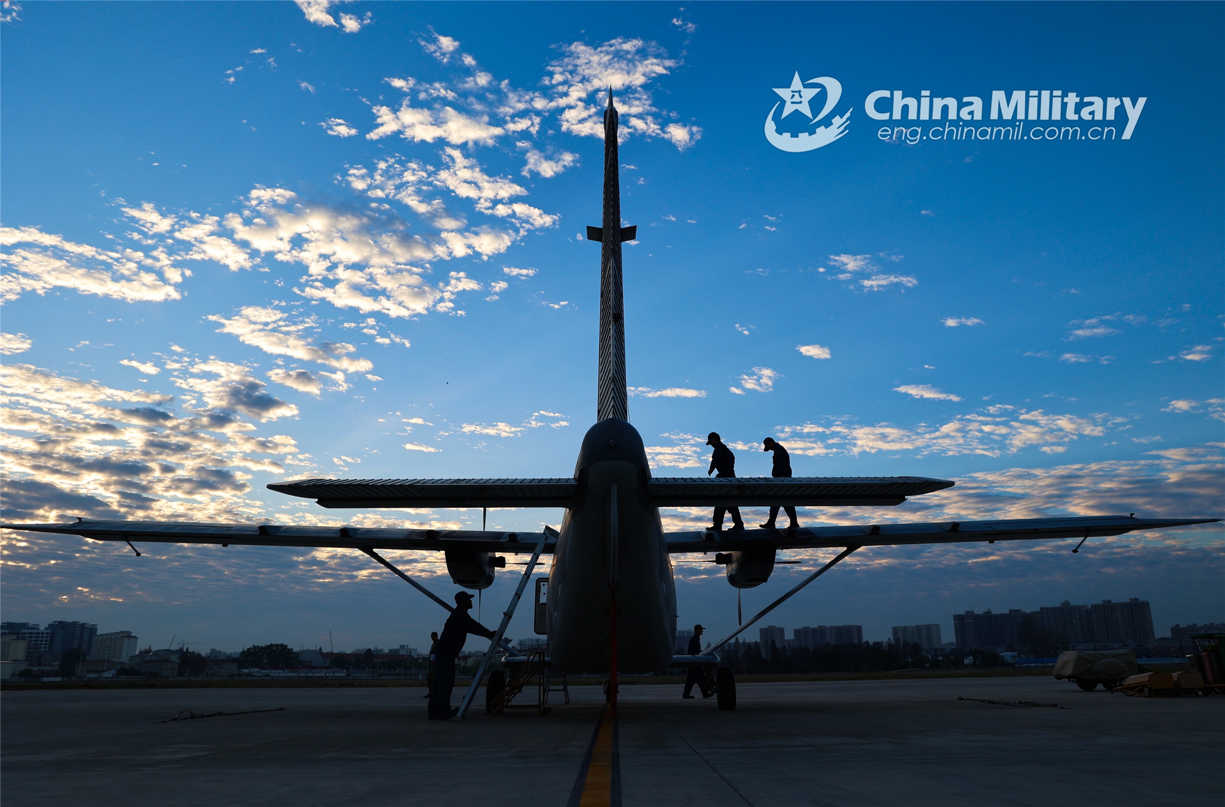 Ground crew members assigned to an airborne brigade of the PLA air force conduct regular inspection and maintenance on a Y-12 transport aircraft during a multi-subject flight training exercise on Oct. 11, 2022. (eng.chinamil.com.cn/Photo by Li Zhuojun)