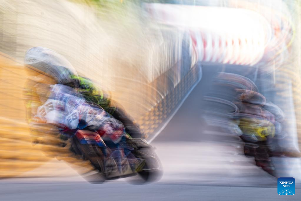 Riders compete during the 54th Macao Motorcycle Grand Prix qualifying match at the 69th Macao Grand Prix in Macao, south China, Nov. 18, 2022. (Xinhua/Cheong Kam Ka)