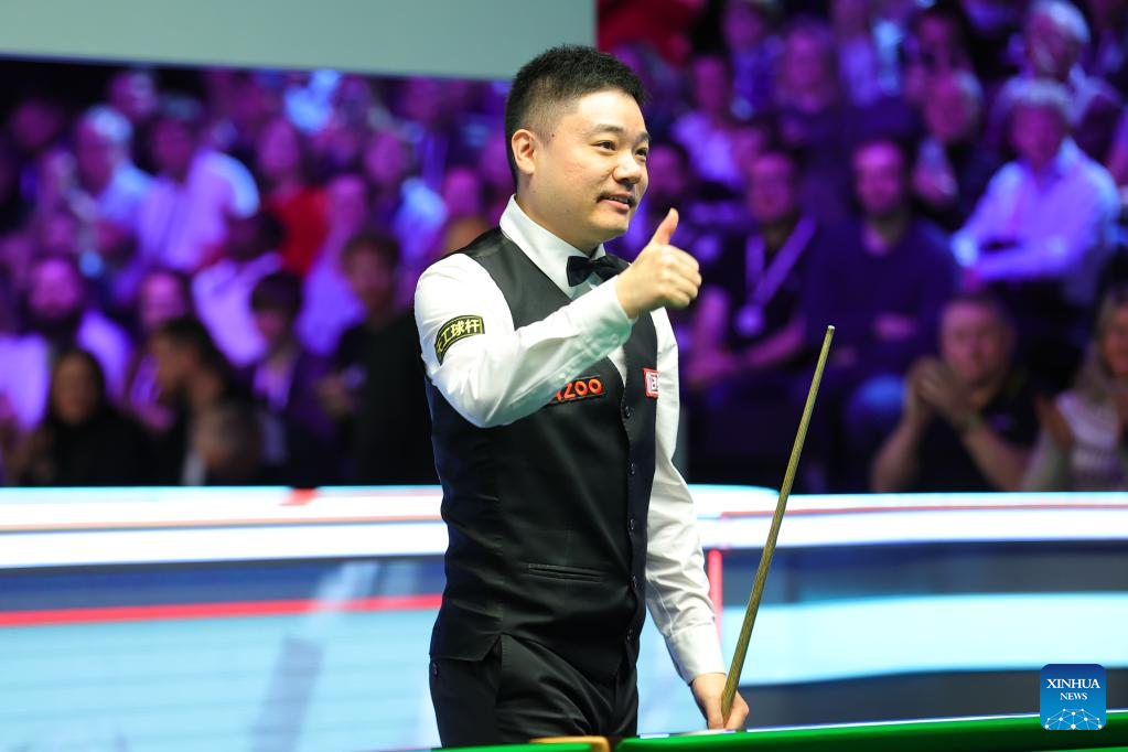 Ding Junhui of China celebrates after the quarter final match against Ronnie O'Sullivan of England at 2022 UK Snooker Championship in York, Britain, Nov. 18, 2022. (Photo by Zhai Zheng/Xinhua)