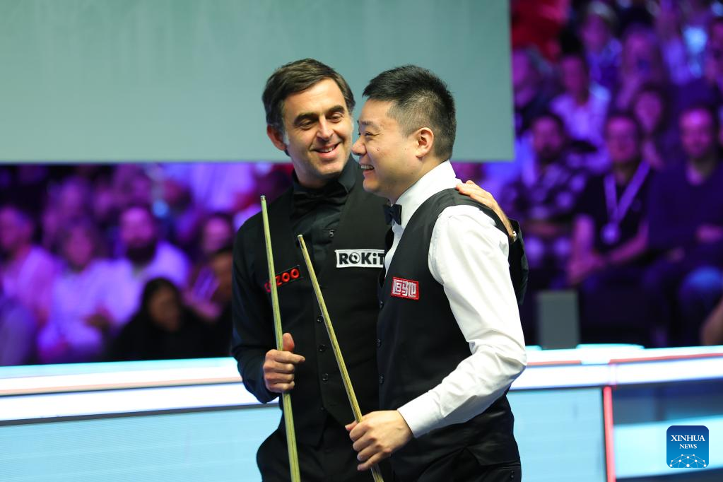 Ding Junhui (R) of China competes during the quarter final match against Ronnie O'Sullivan of England at 2022 UK Snooker Championship in York, Britain, Nov. 18, 2022. (Photo by Zhai Zheng/Xinhua)