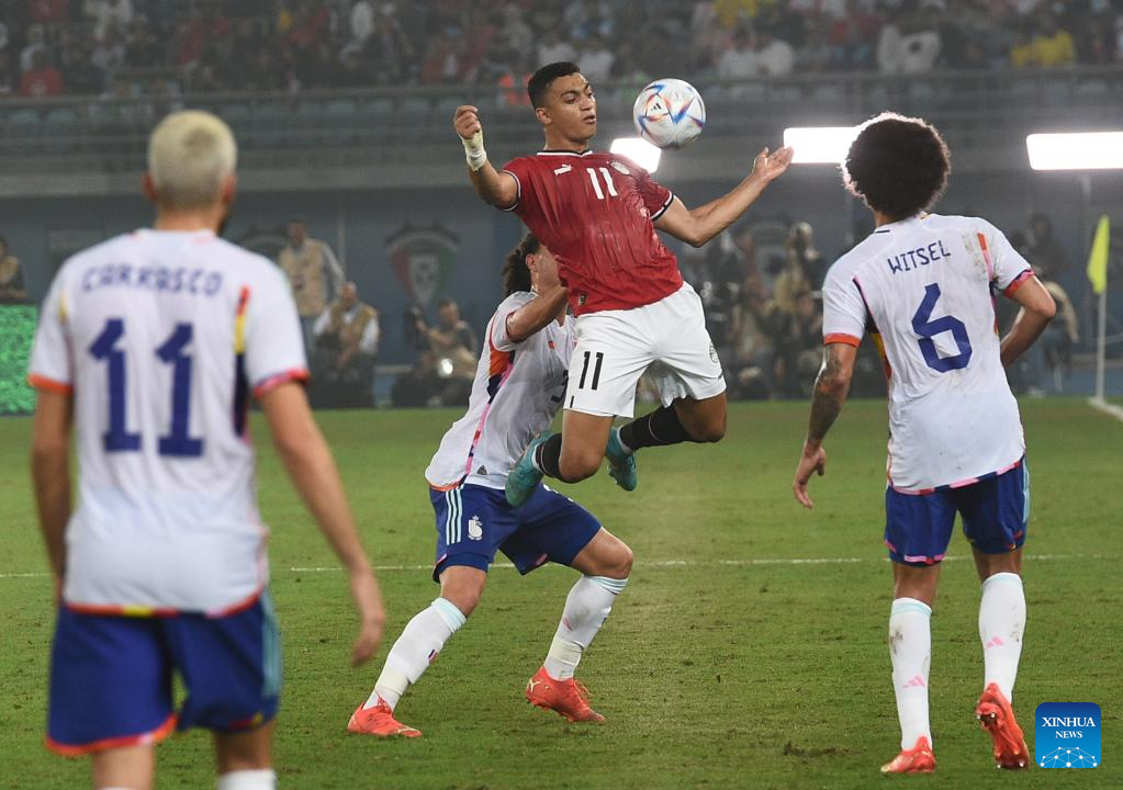 Mustafa Mohammed (2nd R) of Egypt competes during an international friendly football match between Belgium and Egypt at Jaber Al-Ahmad International Stadium in Al Farwaniyah Governorate, Kuwait, on Nov. 18, 2022. (Photo by Asad/Xinhua)