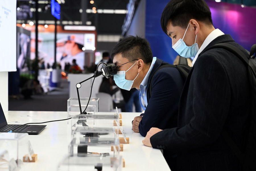 A visitor tries a product at the World Conference on Integrated Circuits 2022 in Hefei, east China's Anhui Province, Nov. 17, 2022. (Xinhua/Zhou Mu)