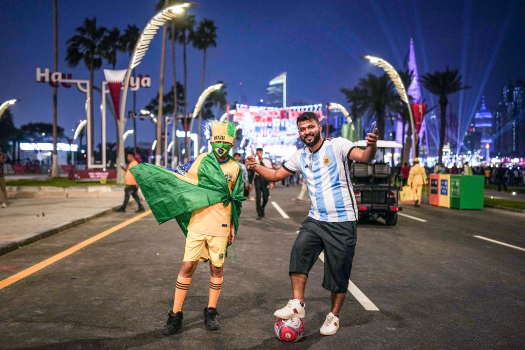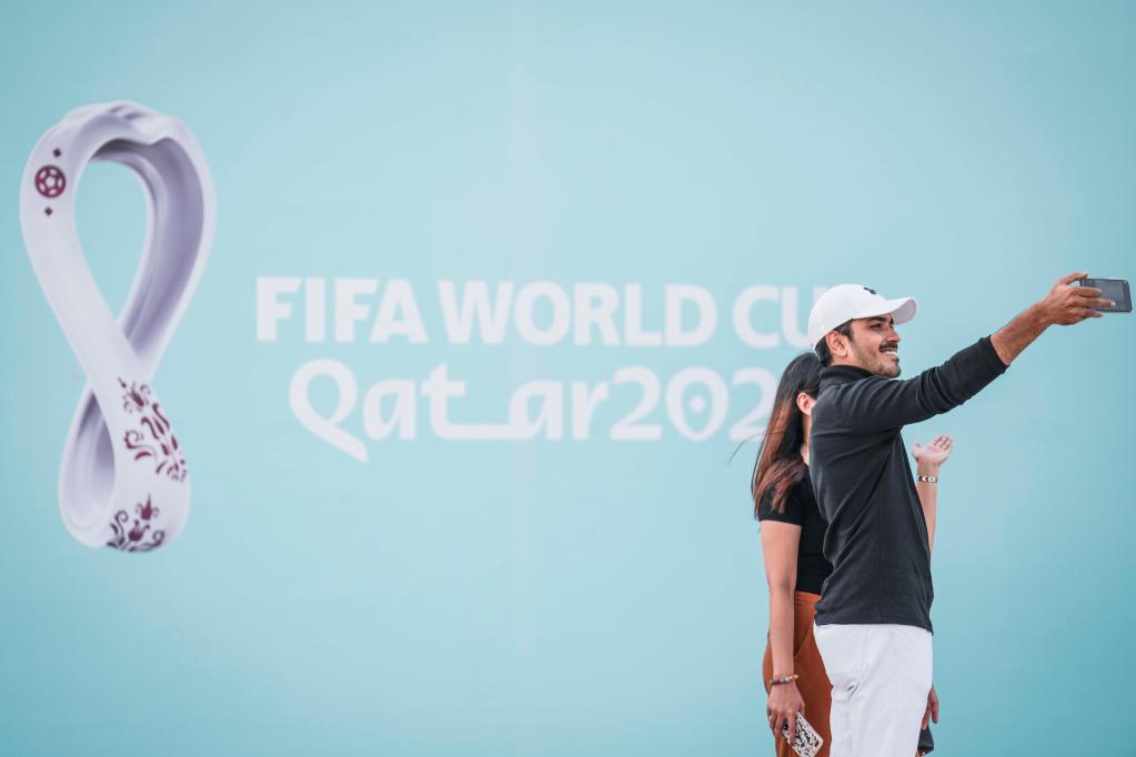 Fans pose for pictures at Al Corniche waterfront in Doha, Qatar, Nov. 18, 2022, ahead of the FIFA World Cup Qatar 2022. (Xinhua/Pan Yulong)