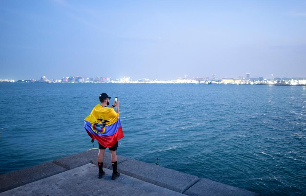 A fan takes pictures at Al Corniche waterfront in Doha, Qatar, Nov. 18, 2022, ahead of the FIFA World Cup Qatar 2022. (Xinhua/Xiao Yijiu)
