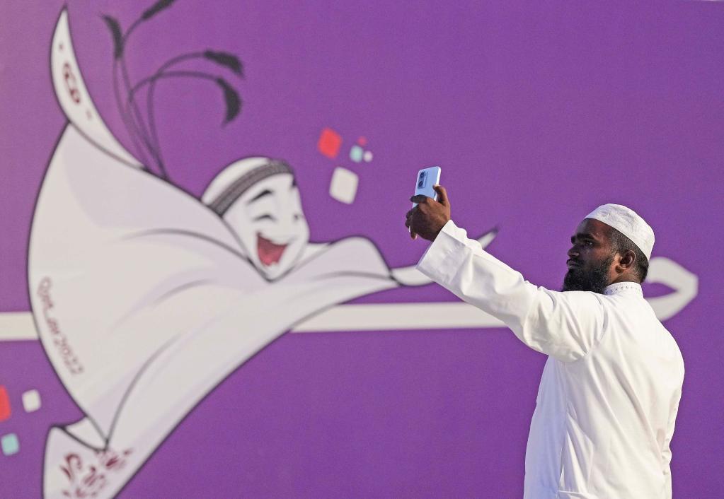 A man takes selfies at a park in Doha, Qatar, Nov. 18, 2022, ahead of the FIFA World Cup Qatar 2022. (Xinhua/Chen Cheng)